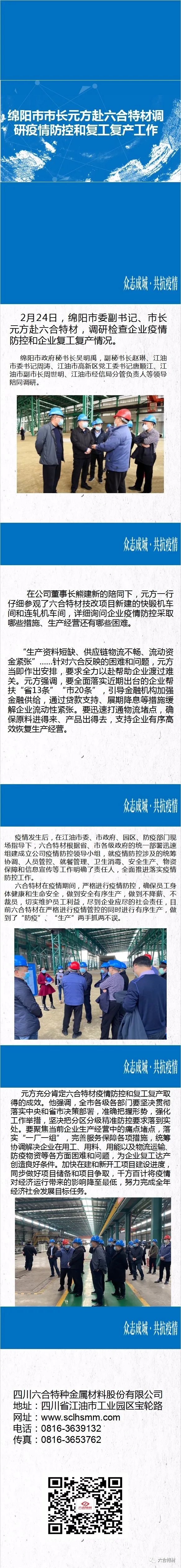 2月24日,绵阳市委副书记、市长元方赴437437必赢国际网址,调研检查企业疫情防控和企业复工复产情况。