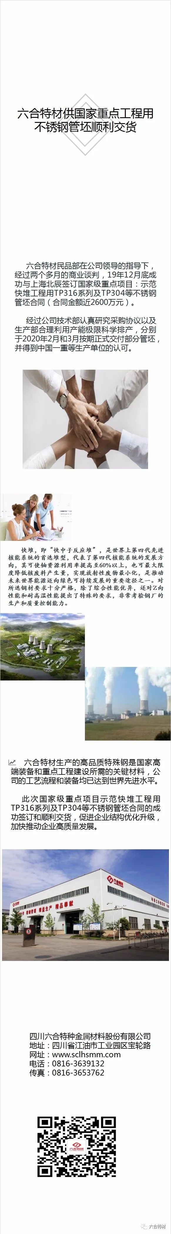 437437必赢国际网址民品部在公司领导的指导下,经过两个多月的商业谈判,19年12月底成功与上海北辰签订国家级重点项目:示范快堆工程用TP316系列及TP304等不锈钢管坯合同,并于2020年2月和3月按期正式交付部分管坯。