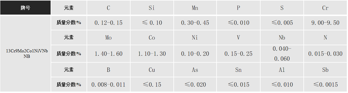 13Cr9Mo2Co1NiVNbNB is a martensitic heat-resistant steel with relatively high strength and good creep resistance. It was developed to meet the higher performance requirements for high-strength heat-resistant steels used in ultra-supercritical steam turbines with steam temperatures exceeding 620℃, and is used for key components, such as medium- and high-pressure rotors in ultra-supercritical units.